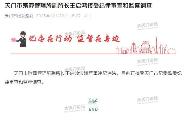 天门市殡葬管理所副所长王启鸿涉嫌严重违纪违法,目前正接受天门市纪委监委纪律审查和监察调查。